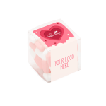 This eco-friendly Recyclable Plastic Clear Cube is filled with Valentine’s Raspberry & Milk Flavour Gums.